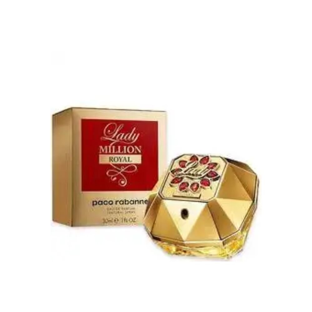 Lady Million Royal Paco Rabanne for women е цветно-плодов аромат за жени с кадифени дървесни нюанси, лансиран през 2023 г. от известната италианска марка Paco Rabanne. Това е допълнение към линията аромати Lady Million. Този път обаче модната къща променя концепцията и предлага съвсем различен поглед към популярния аромат. Lady Million Royal предизвиква усещането за елегантност и блясък, които са отличавали всяка кралска династия. Ароматът разкрива кралицата, която всяка дама мечтае да бъде. Неговата цел е да ви освободи от всякакви ограничения и да покаже една смела и дръзка женска чувственост. Парфюмната пирамида съдържа възхитителни връхни нотки на нар. Средните флорални нотки на бели цветове пленяват със свежест и красота на излъчването, разтваряйки се в топлината на интензивни и кадифени дървесни нотки в базата. Това е смела, но чувствена комбинация, която със сигурност ще спечели сърцата на много жени. Връхни нотки: нар